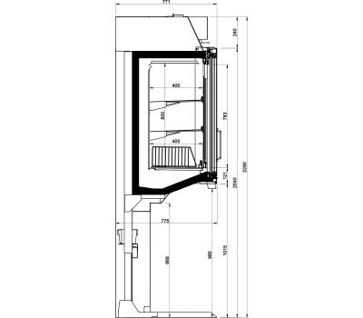 The uprights and feet allow the cabinet to be easily placed on top of well type cabinets to double the display surface for the same floor area.