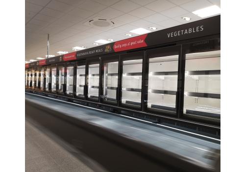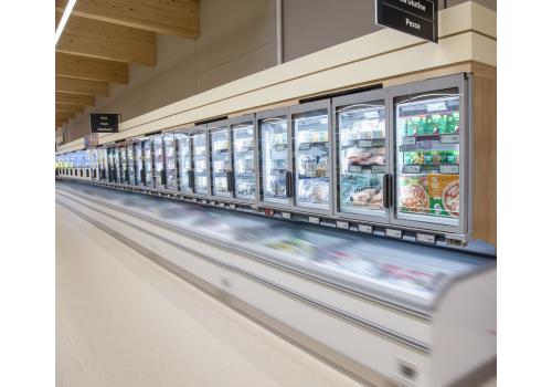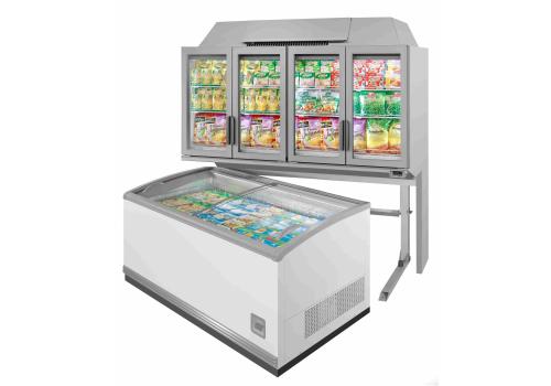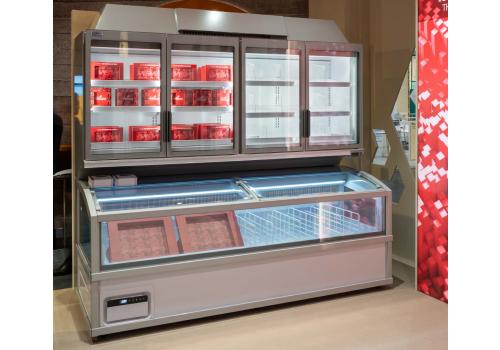 Vertical plug-in refrigerated cabinet with doors powered by propane refrigerant gas (R290), dedicated to the display of frozen products but always convertible offering the flexibility to display fresh pre-packed products.