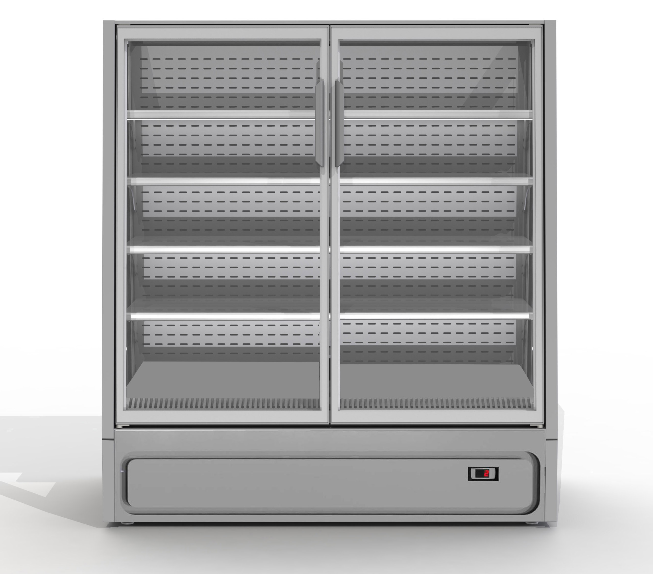 Semi-vertical plug-in refrigerated cabinet with doors powered by propane refrigerant gas (R290) that guarantees an outstanding presentation of fresh pre-packed products.