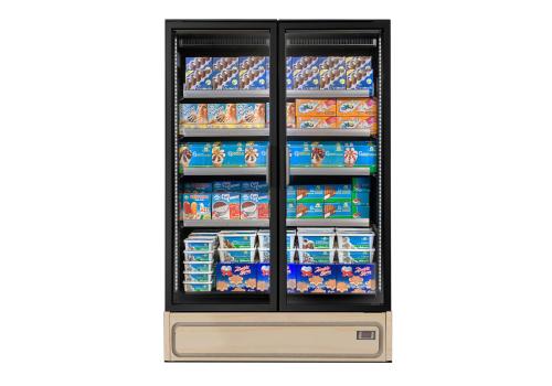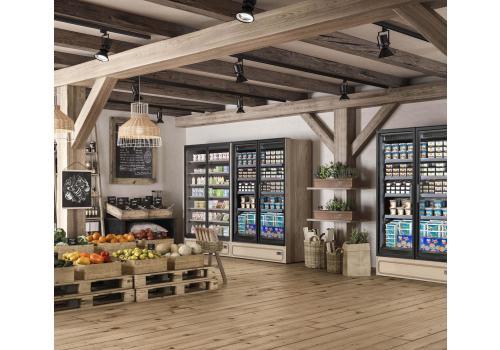 Steckerfertiger Tiefkühlschrankmit integriertem Aggregat, betrieben mit dem Kältemittel R290 und ideal geeignet für den Verkauf von frischer, biologischer Tiefkühlkost.