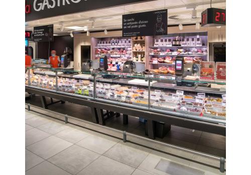 Bedienungstheke mit kompakten Abmessungen, die sich durch Flexibilität, ein hervorragendes Merchandising und maximale Ergonomie auszeichnet.