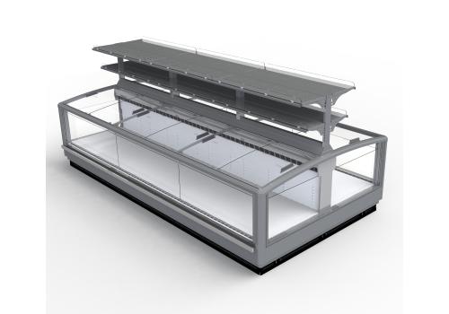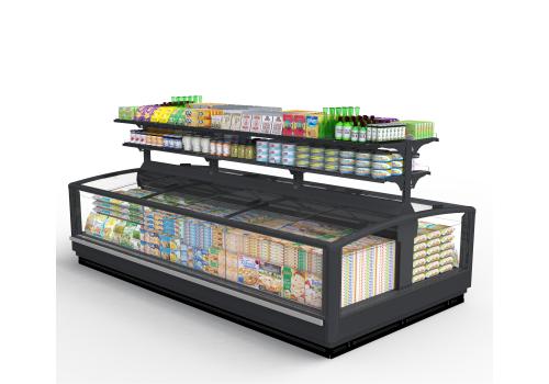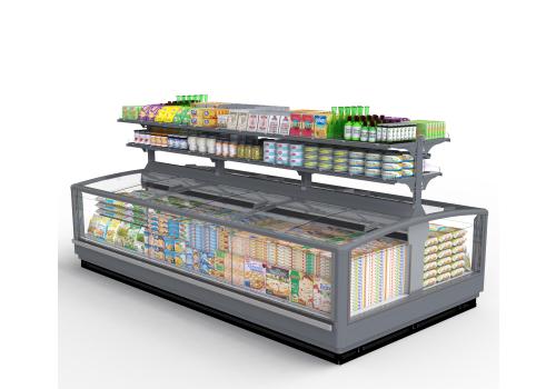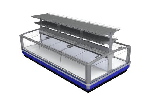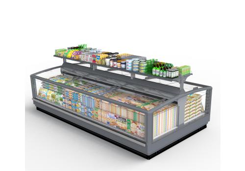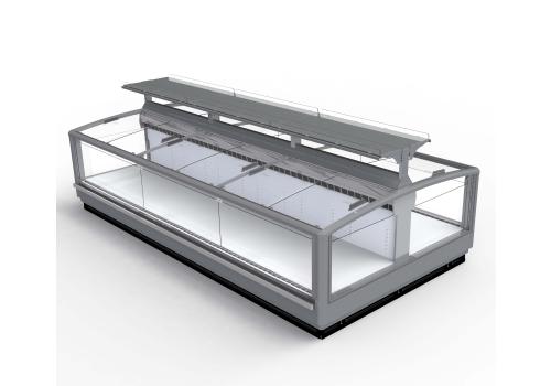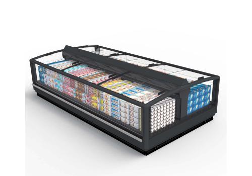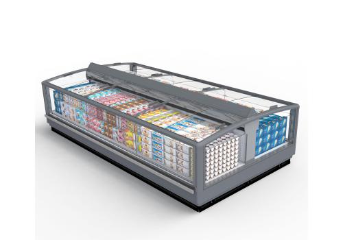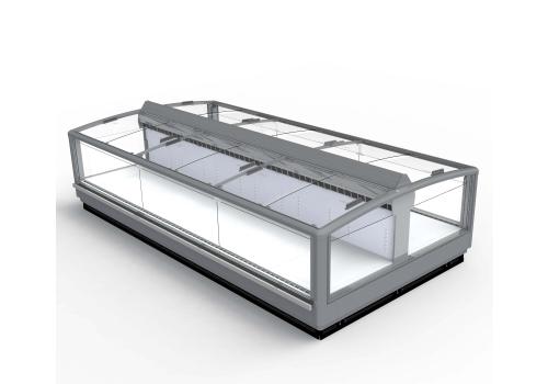 Horizontal island fridge cabinet and remote unit for frozen products. It is characterised by large glass panels for total visibility of the product on display.