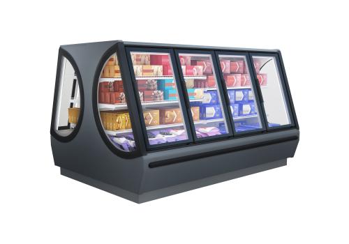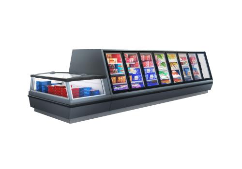 A semi-vertical freezer that creates a marketplace feel in the freezer section.