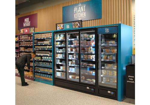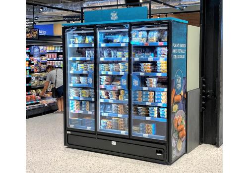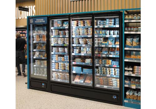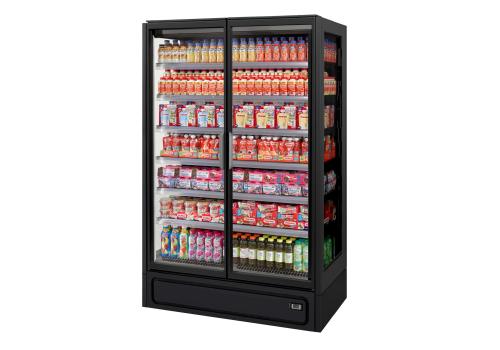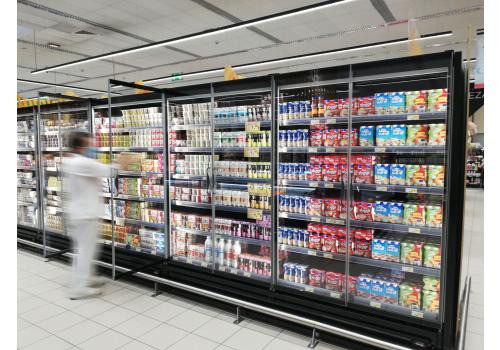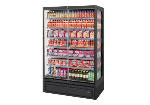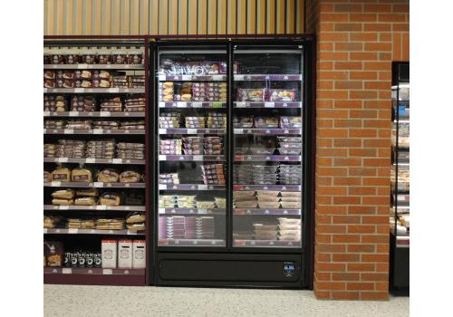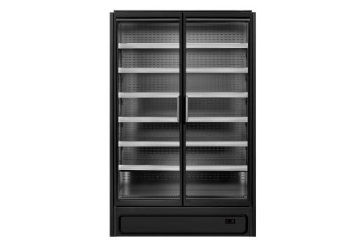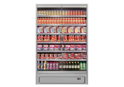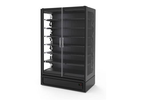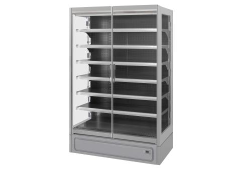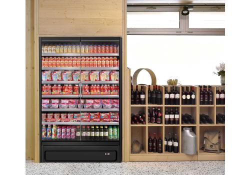 Vertical plug-in refrigerated cabinet with doors powered by propane refrigerant gas (R290) that guarantees outstanding presentation of fresh pre-packed products.