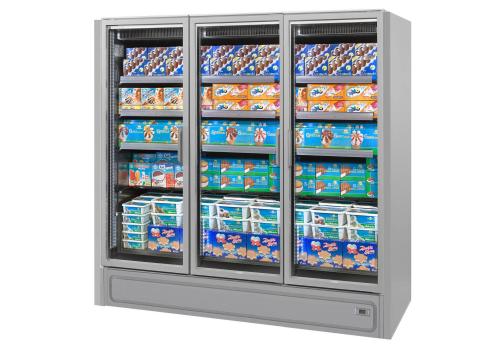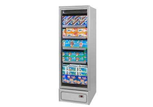 Vertical plug-in refrigerated cabinet with doors powered by propane refrigerant gas (R290) that guarantees excellent presentation of frozen products.