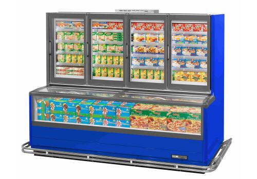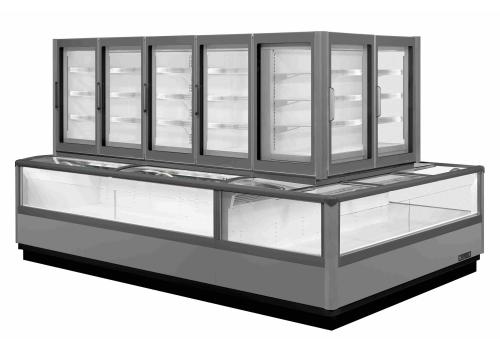 Keskuskoneellinen yhdistelmäpakastekaluste. Kalusteessa yhdistyy liukukannellinen allas yläosan lasiovikaapin kanssa. Lasiovet ovat koko yläosan korkuiset.