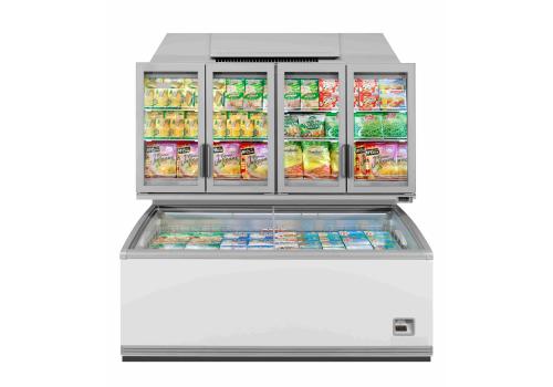 Meuble réfrigéré ou surgelé vertical avec portes et groupe logé fonctionnant au gaz propane R290, dédié à l'exposition de surgelés, mais toujours convertible pour pouvoir aussi exposer des produits frais préemballés.