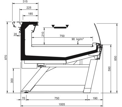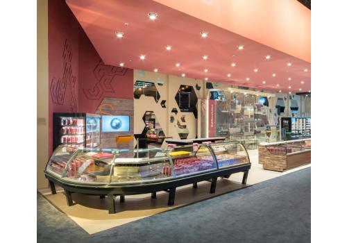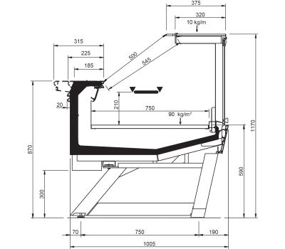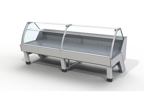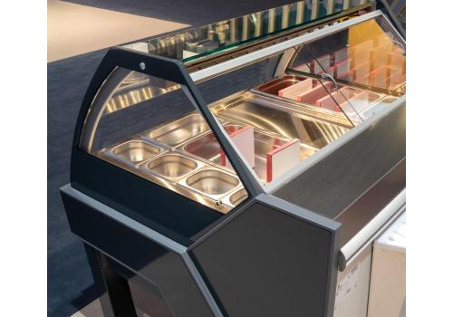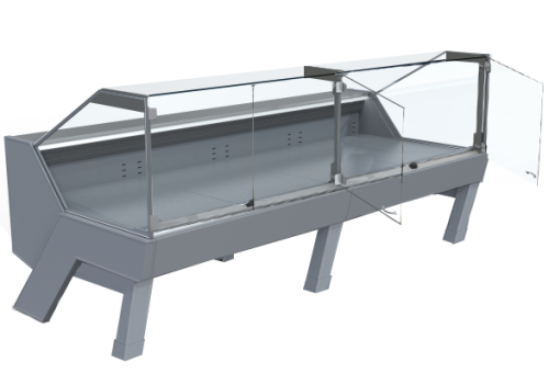 Disponible en plusieurs longueurs, avec angles ouverts et fermés et avec de multiples superstructures et vitrages. Son design élégant se caractérise par la façade et les panneaux inclinés personnalisables dans différentes couleurs. La version avec pieds inclinés confère au meuble réfrigéré une légèreté accrue.