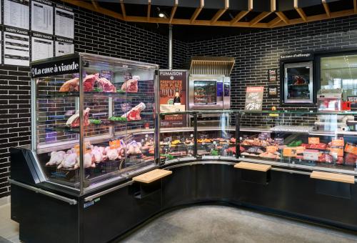 La Place du Marché, che corre lungo il perimetro del punto vendita ne è l'esempio chiave. Nel corner dedicato alla Macelleria, Salumeria e Formaggi domina il banco frigo tradizionale Velvet con estetica Design, dal frontale monolitico nero e dettagli in legno creati ad hoc per assicurare il distanziamento tra i Clienti in attesa. Degna di nota anche la Torre di Maturazione il cui design tutto vetro è studiato per catturare l'attenzione dei Clienti verso i tagli più pregiati.