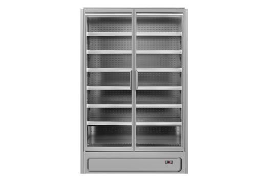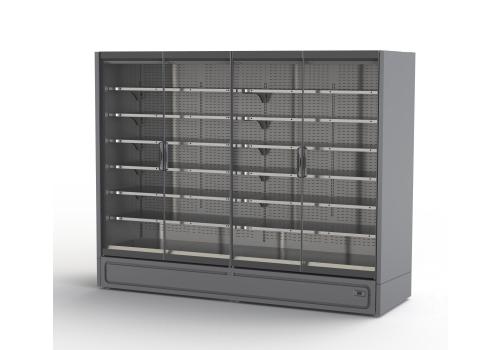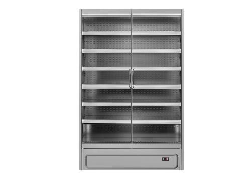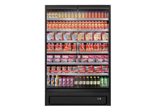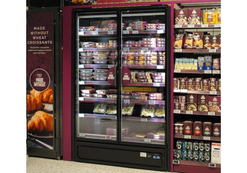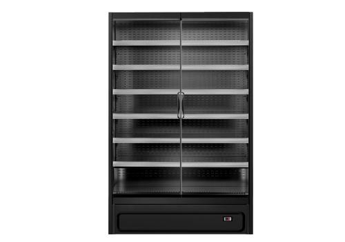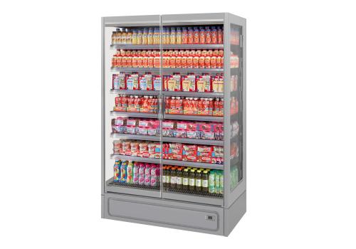 Banco frigo verticale con porte e gruppo incorporato funzionante a gas propano R290 che garantisce una presentazione d'eccellenza dei prodotti freschi preconfezionati.
