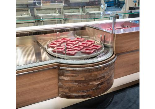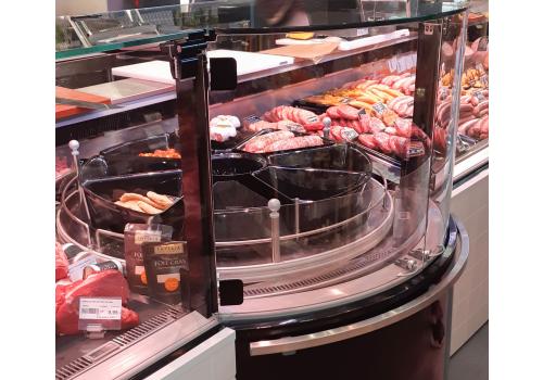Vetrina tradizionale refrigerata con frontale curvo in grado di movimentare il merchandising delle referenze esposte, con un'esposizione accattivante grazie anche al piano rotante.