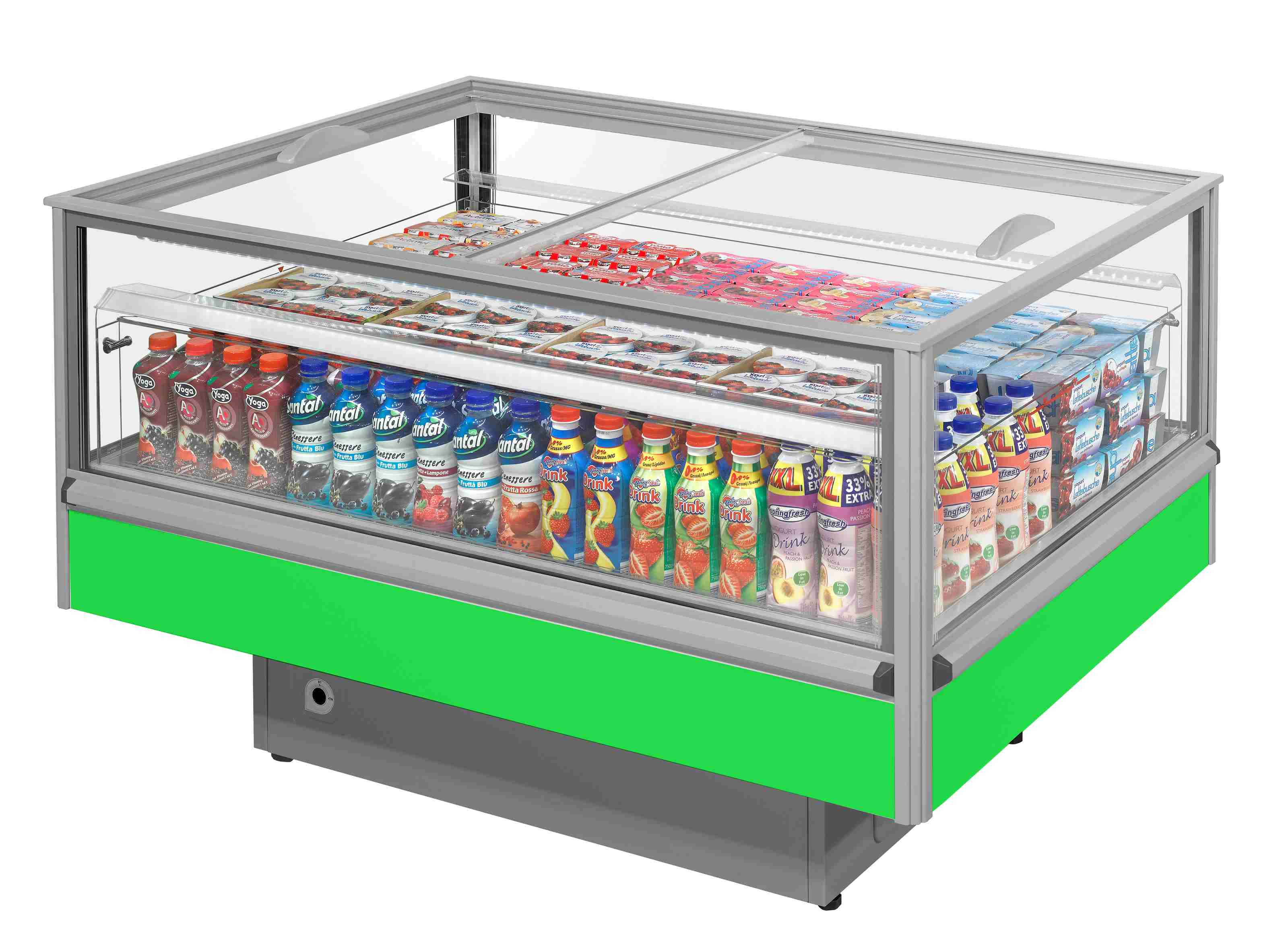 Panoramic plug-in refrigerated island powered by propane refrigerant gas (R290), available as an LT/MT switchable version with sliding glass panels and in the open MT version without sliding panels.
