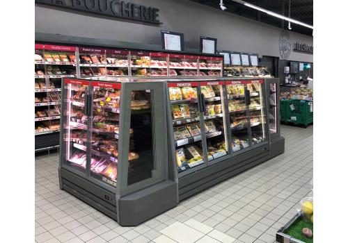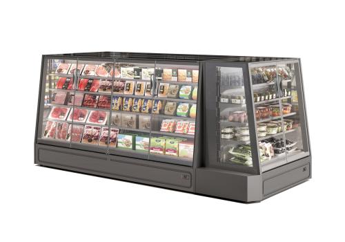 Excellent overview of the products thanks to the shelves arranged in a cascading manner and to the exclusive glass roof. Flexible layout for in line or island compositions.