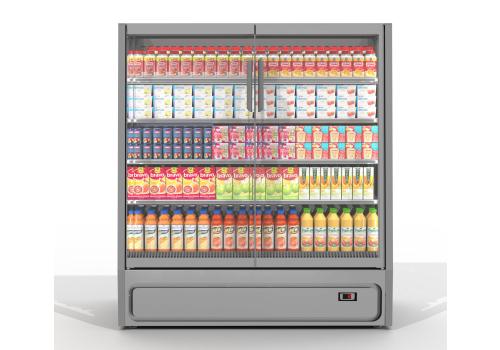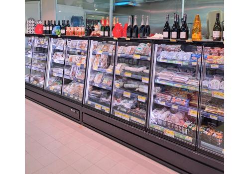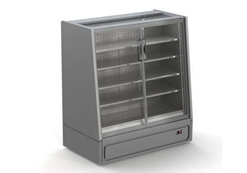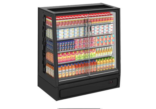 Semi-vertical plug-in refrigerated cabinet with doors powered by propane refrigerant gas (R290) that guarantees an outstanding presentation of fresh pre-packed products.