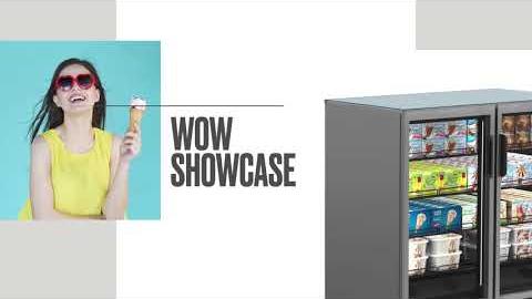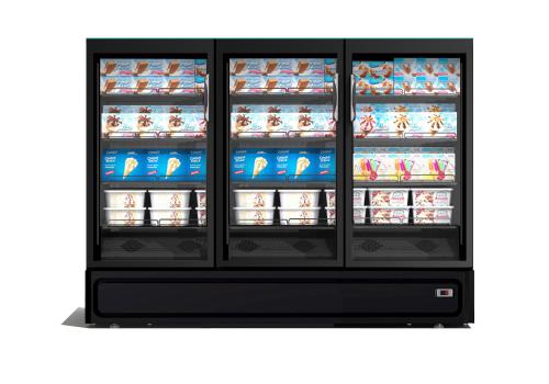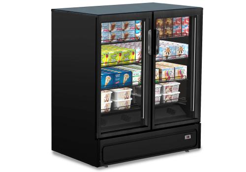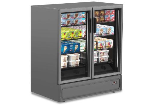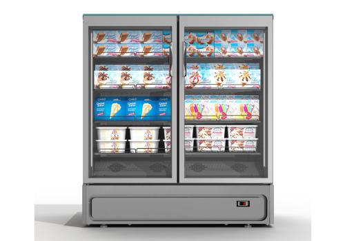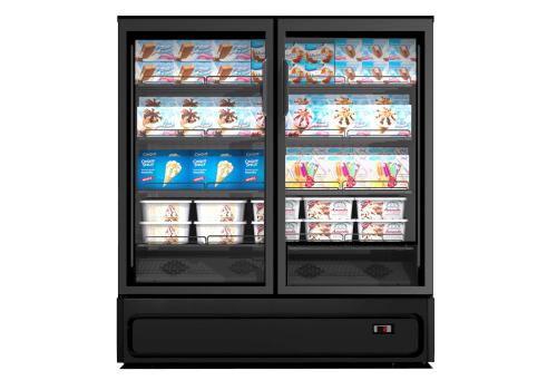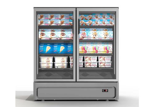 Semi-vertical plug-in refrigerated cabinet with doors powered by propane refrigerant gas (R290) that guarantees excellent presentation of frozen products.