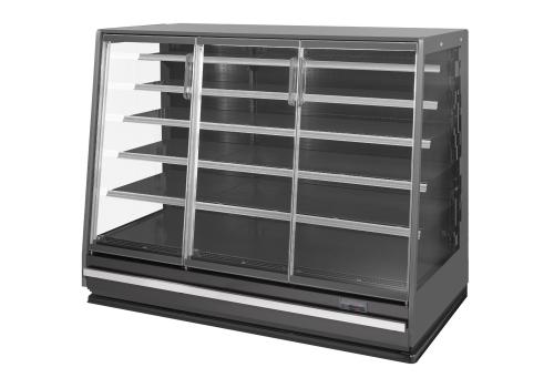Semivertical chilled display cabinet with tilted or sliding doors and remote unit for fresh pre-packed products. It features excellent merchandising, low consumption, and perfect preservation of the product on display.