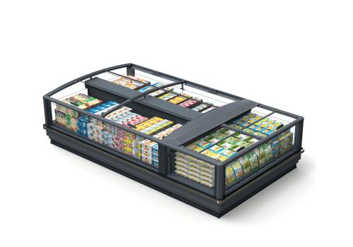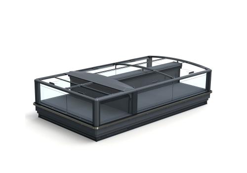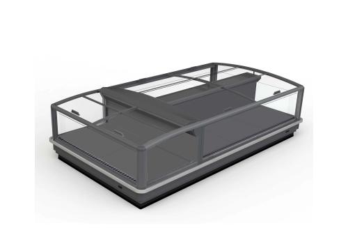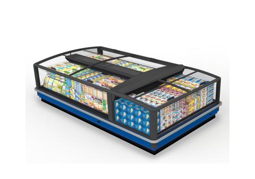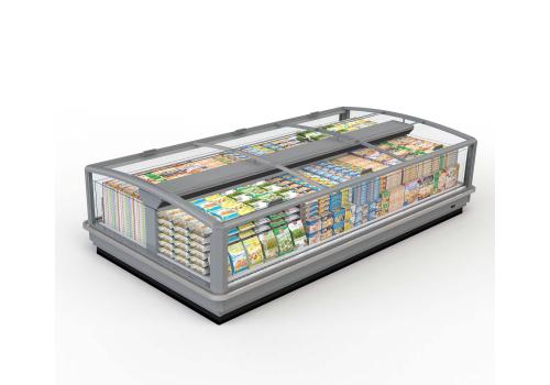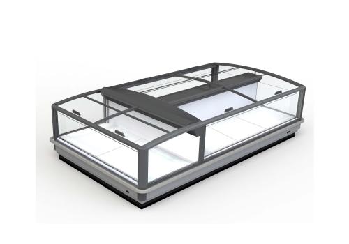 Horizontal island fridge cabinet and remote unit for frozen products. It is characterised by large glass panels for total visibility of the product on display.