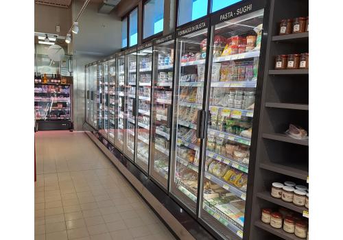 Vertical plug-in refrigerated cabinet with doors powered by propane refrigerant gas (R290) that guarantees outstanding presentation of fresh pre-packed products