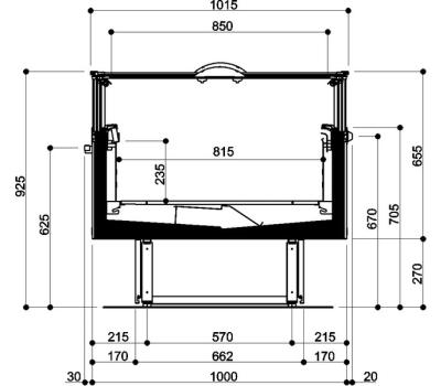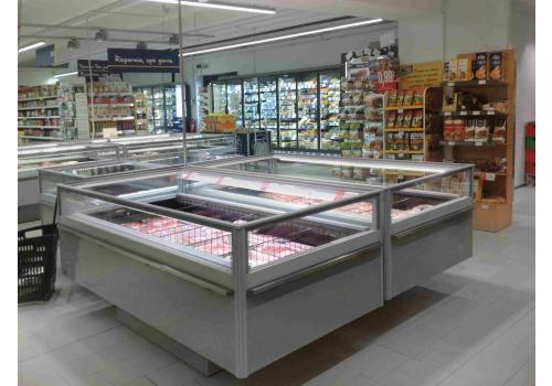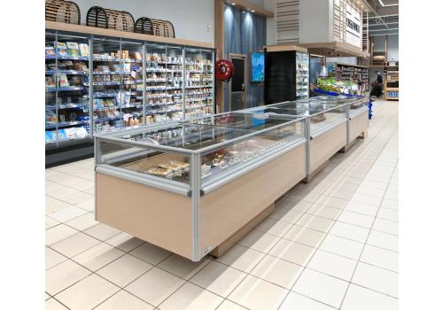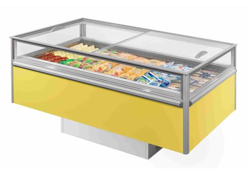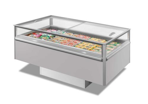 Panoramic plug-in refrigerated island powered by propane refrigerant gas (R290), available as an LT/MT switchable version and in the MT version characterised by modern and essential design.