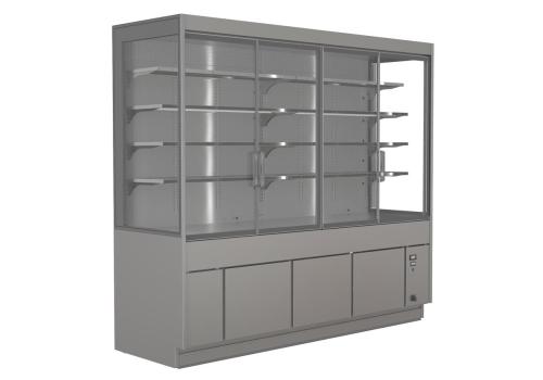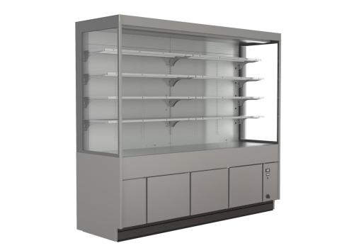 Chilled rear cabinet with remote unit featuring modern and essential aesthetics, available in 3 heights (2000, 2300 and 2600 mm), that sets itself apart for great versatility and multifunctional applications.